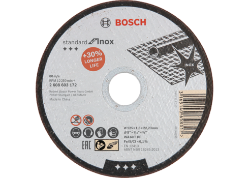 Tarcza tnąca Standard for Inox to niezawodne narzędzie do obróbki stali Inox. Wykonana z tlenku glinu tarcza została specjalnie zaprojektowana do obróbki stali Inox. Nie zawiera żelaznych, siarkowych ani chlorowych wypełniaczy. Tarcza przystosowana do cięcia stali Inox. Pasuje do szlifierek kątowych marki Bosch.